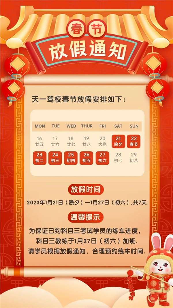 值此新春佳節(jié)來臨之際,天一駕校全體員工祝廣大市民新春快樂!萬事如意!兔年大吉!